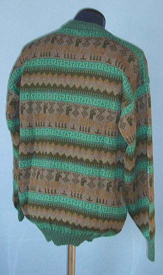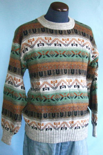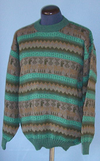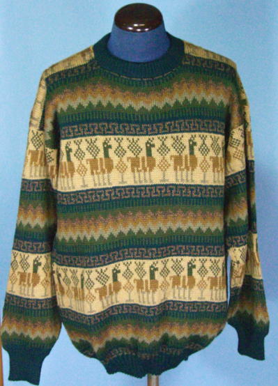 | アルパカをデザインした落ち着いた色の男性用セーターです。それでも普通のセーターとは「ちょっと違う」と感じることでしょう。ジャケットの下でもモコモコすることなく、軽くて暖かいので、おしゃれな男性にお薦めですね。1枚限りの限定です。ペルー製アルパカ セーターです。アルパカセーターの特徴である、暖かくて、軽いすばらしいセーターです。男女兼用ですが、男性にお薦めします。 |
