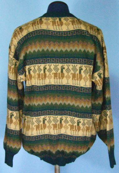 | アルパカをデザインしたちょっと渋めの男性用セーターです。ジャケットの下でもモコモコすることなく、軽くて暖かいので、おしゃれな男性にお薦めですね。色は抑え目ですが、デザインはかなり派手なので、目立ちますよ。もちろん良い意味で。きっと「良いセーターですね」と褒められることでしょう。各色1枚限りの限定です。ペルー製アルパカ セーターです。アルパカセーターの特徴である、暖かくて、軽いすばらしいセーターです。男女兼用ですが、男性にお薦めします。 |